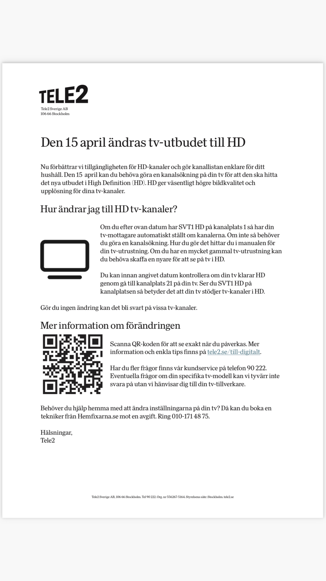 Tele2 har meddelat att de nu kommer att byta vissa kanaler till HD kvalité. Det kan innebära att någon plötsligt saknar någon kanal. Information finns bifogat i denna nyhet. Förändringen är hos Tele2 så styrelsen kan inte hjälpa till att svara på frågor. Det finns information på namntavlorna i trappuppgångarna med kontaktinformation till Tele2.